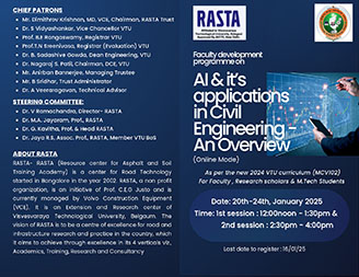 RASTA an Extension and Research Centre of Visvesvaraya Technological University (VTU), one of the largest Technological Universities in India, is offering post graduate courses and Ph.D programs for Civil Engineering graduates. The purpose of the PG Courses is to train the students with a curriculum that emphasizes on practical training, thus churn out competent highway engineers befitting industry needs.